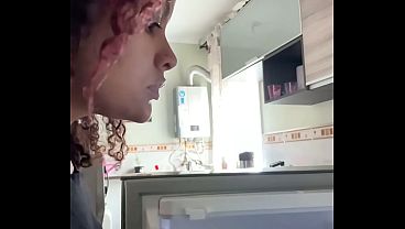 Latina paffuta che cucina in mutandine e maglietta, grande culo grasso e pancia che si muove
